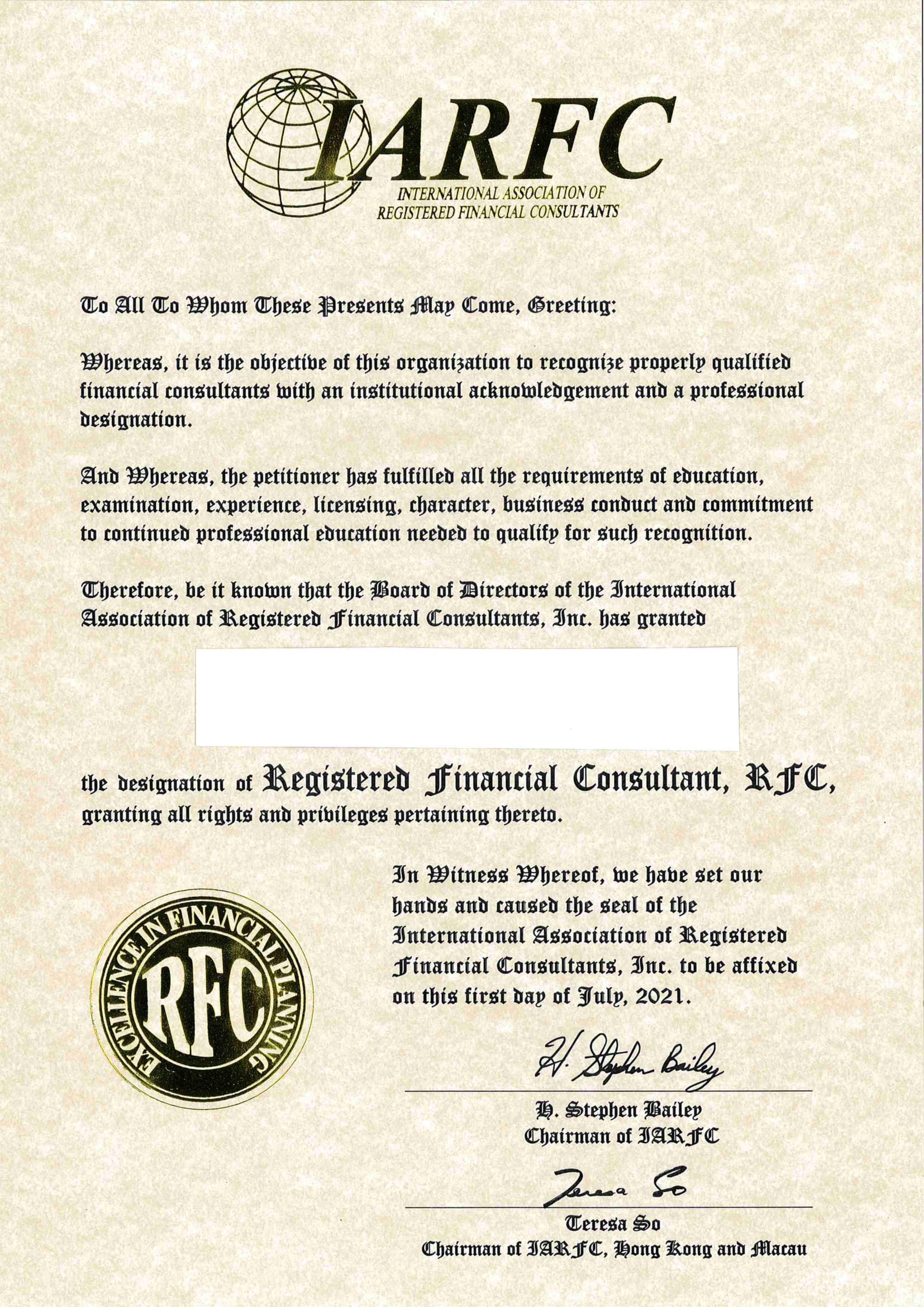 RFC 是 Registered Financial Consultant (認證財務顧問師) 的簡稱,是美國 International Association of Registered Financial Consultants (國際認證財務顧問師協會,簡稱 IARFC) 頒授予在教育、經驗和誠信各方面均達至卓越水準的財務顧問會員之專業認證。