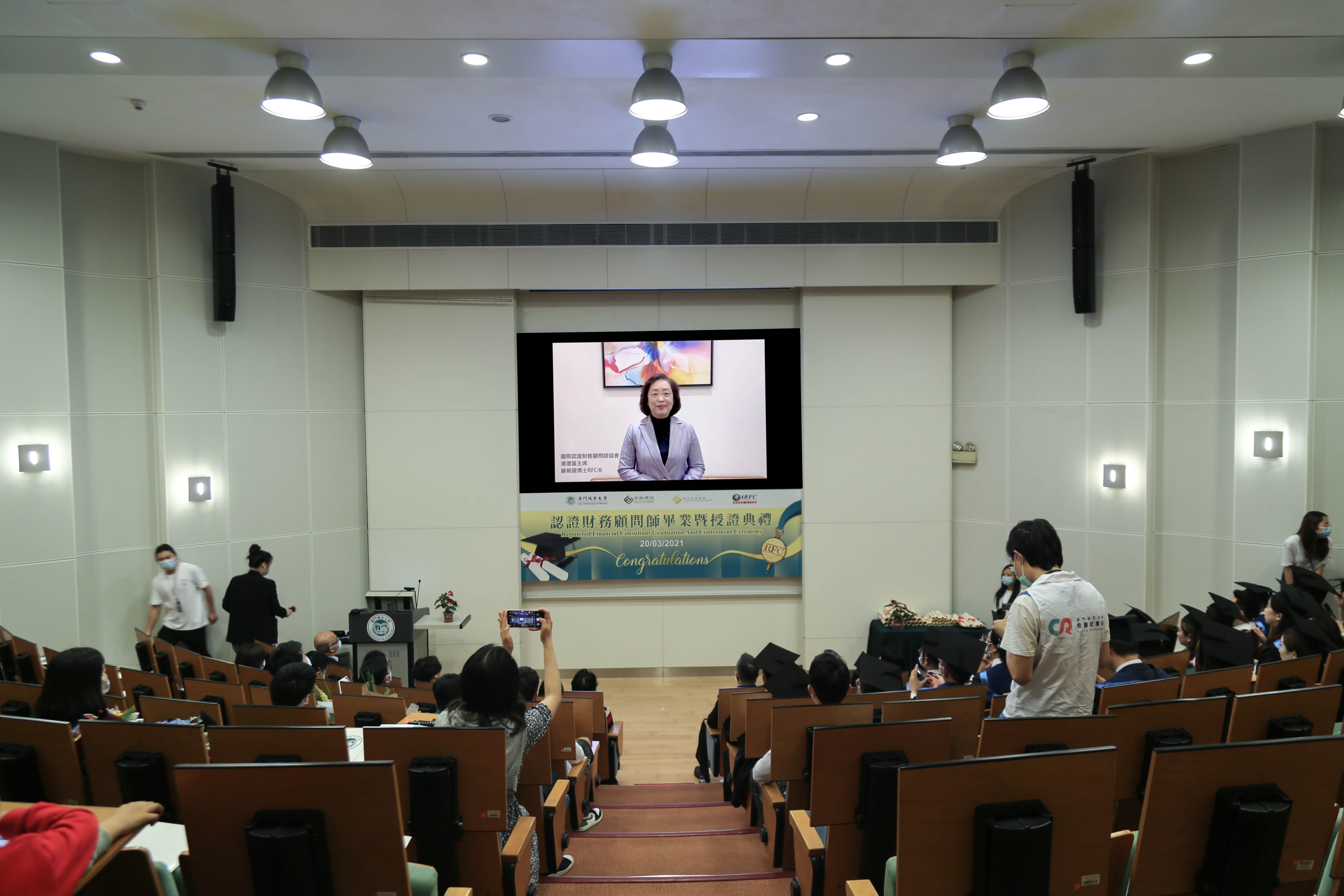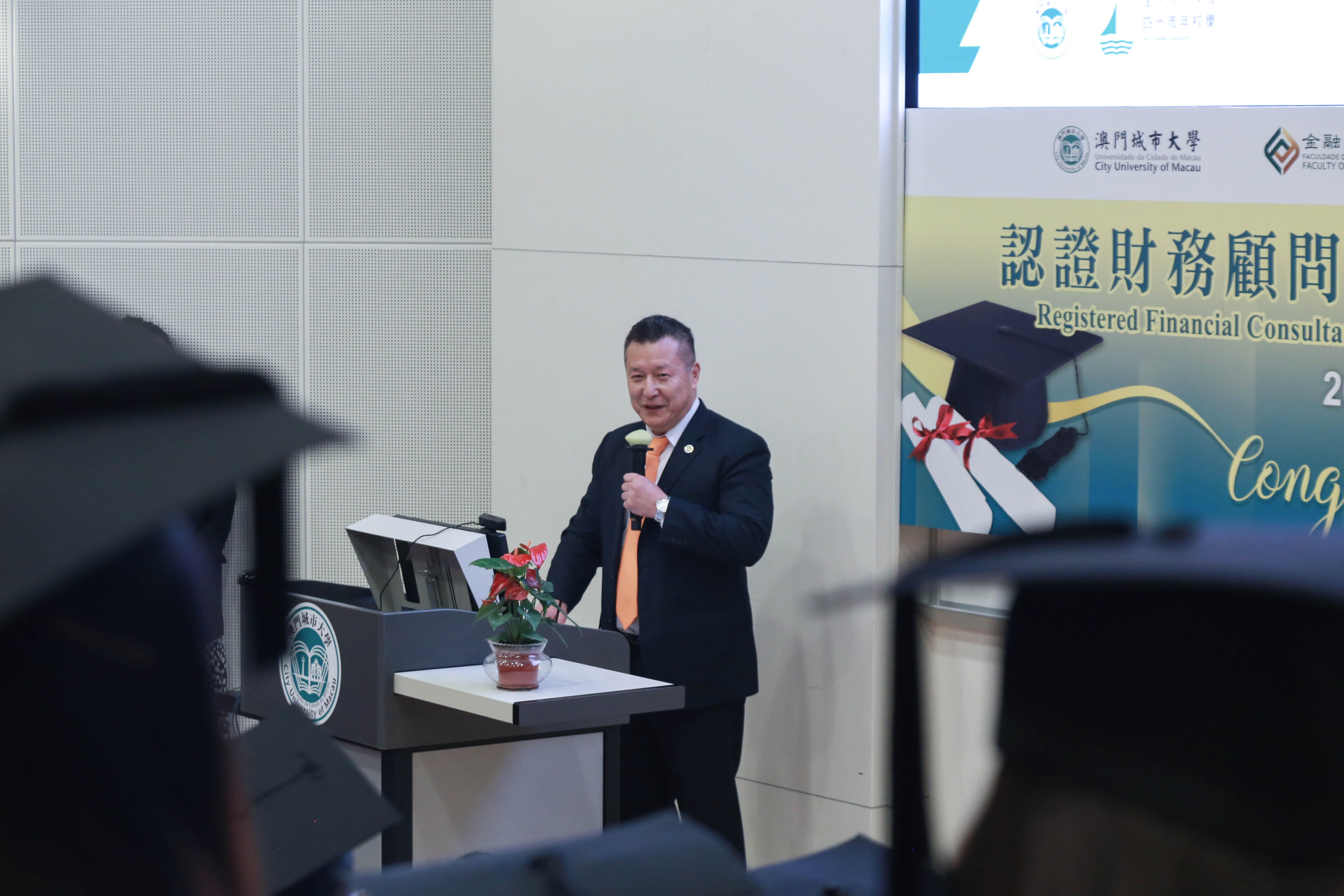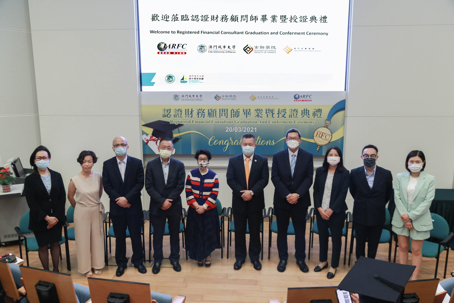 認證財務顧問師畢業暨授證典禮於二零二一年三月二十日(星期六)假座澳門城市大學隆重舉行。典禮榮獲國際認證財務顧問師協會港澳區主席蘇婉薇博士RFC®、澳門城市大學校長劉駿教授及澳門金融學會管理委員會主席黃善文先生擔任主禮嘉賓。蘇主席因在新冠肺炎疫情下港澳兩地通關限制而未能親赴典禮現場,固以視像主禮並致辭。劉教授和黃主席於典禮中分別致辭勉勵各獲授證學員。其他出席典禮嘉賓包括澳門城市大學財務總監劉笑媚女士、澳門城市大學金融學院院長張偉光教授及副院長鄺婉樺副教授、澳門資產管理協會會長朱展林先生、澳門金融學會管理委員會秘書長官惠玲小姐和跨國保險集團眾高層。二十多名獲授證學員皆同眾多至愛親朋出席典禮,共享喜悅。
