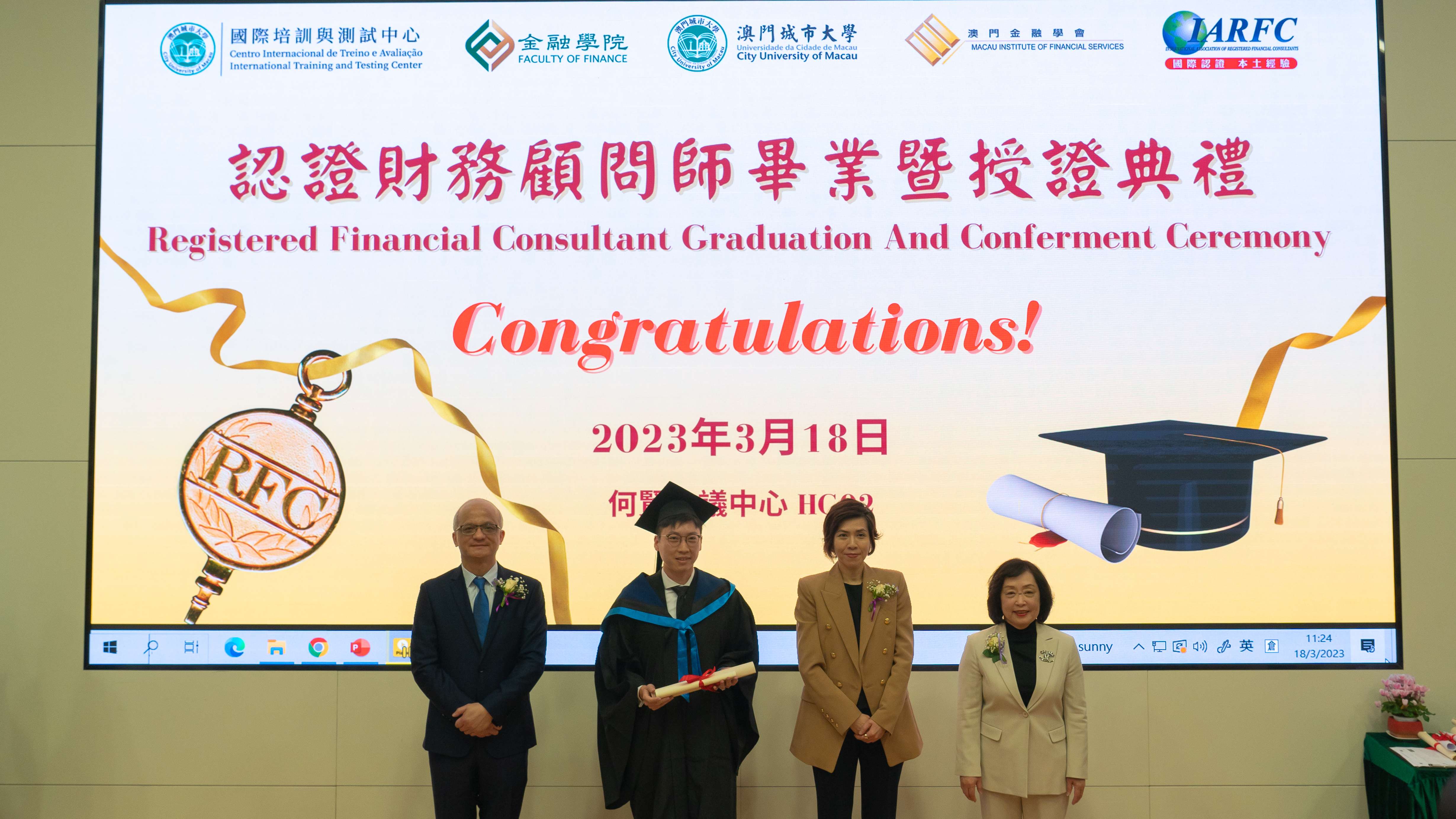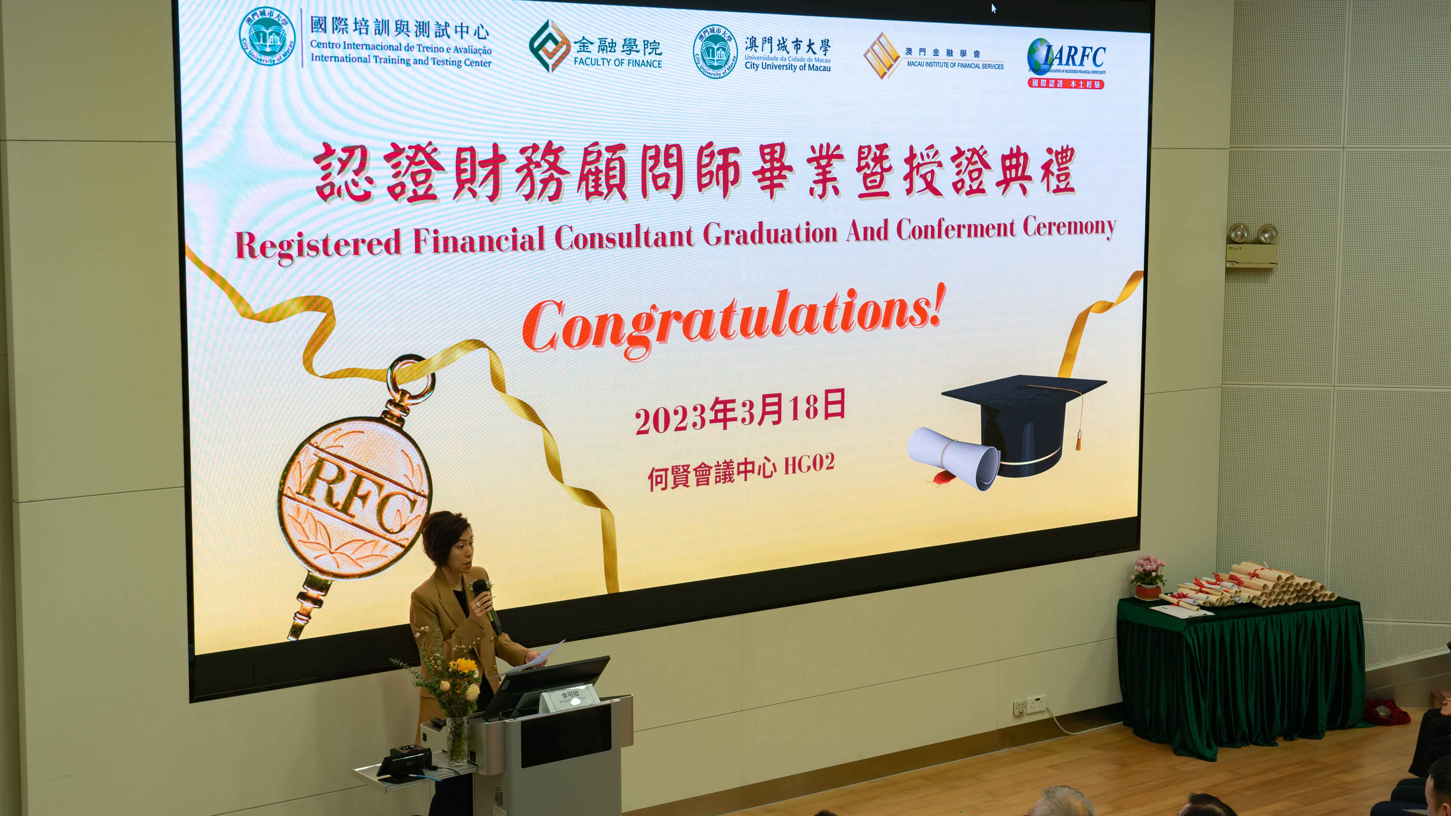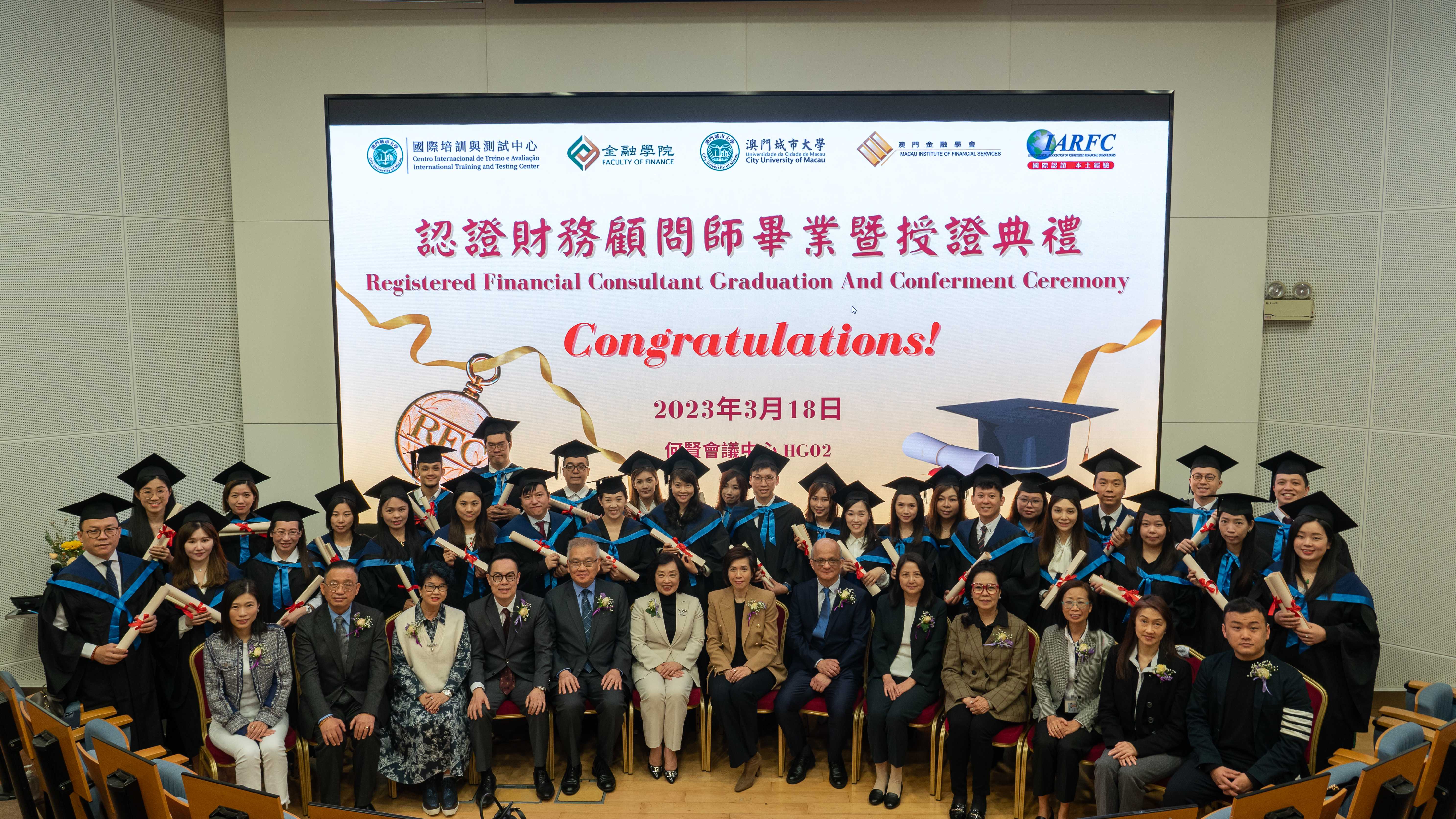 認證財務顧問師畢業暨授證典禮於二零二三年三月十八日(星期六)假座澳門城市大學隆重舉行。典禮榮獲國際認證財務顧問師協會港澳區主席蘇婉薇博士RFC®、澳門城市大學金融學院院長張偉光教授及澳門金融學會管理委員會主席李可欣女士擔任主禮嘉賓。蘇博士,張教授和李主席於典禮中分別致辭勉勵各獲授證學員。其他出席典禮嘉賓包括澳門城市大學金融學院副院長鄺婉樺副教授、澳門城市大學國際培訓與測試中心主任何珍女士、澳門資產管理協會會長朱展林博士RFC®、澳門金融學會管理委員會秘書長官惠玲小姐和著名跨國保險公司眾高層。三十多名獲授證學員皆同眾多至愛親朋出席典禮,共享喜悅。