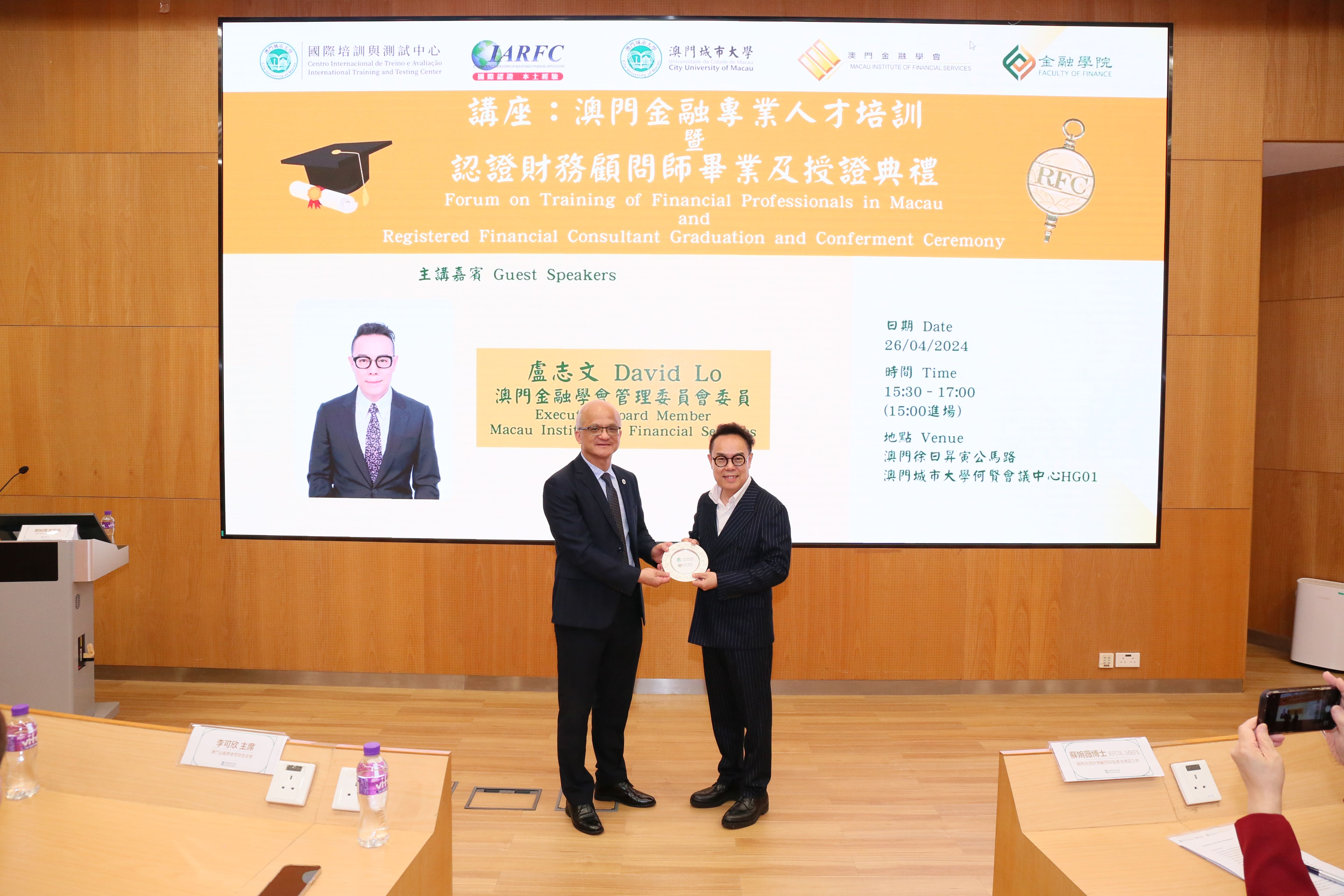 專題講座緊接典禮後進行,大會榮獲澳門金融學會管理委員會委員盧志文先生RFC®擔任專題演講嘉賓。盧先生以「澳門金融專業人材培訓」為題,向眾與會者闡釋澳門金融專業人材應如何積極自身裝備以面對日益煩覆的客戶需求。