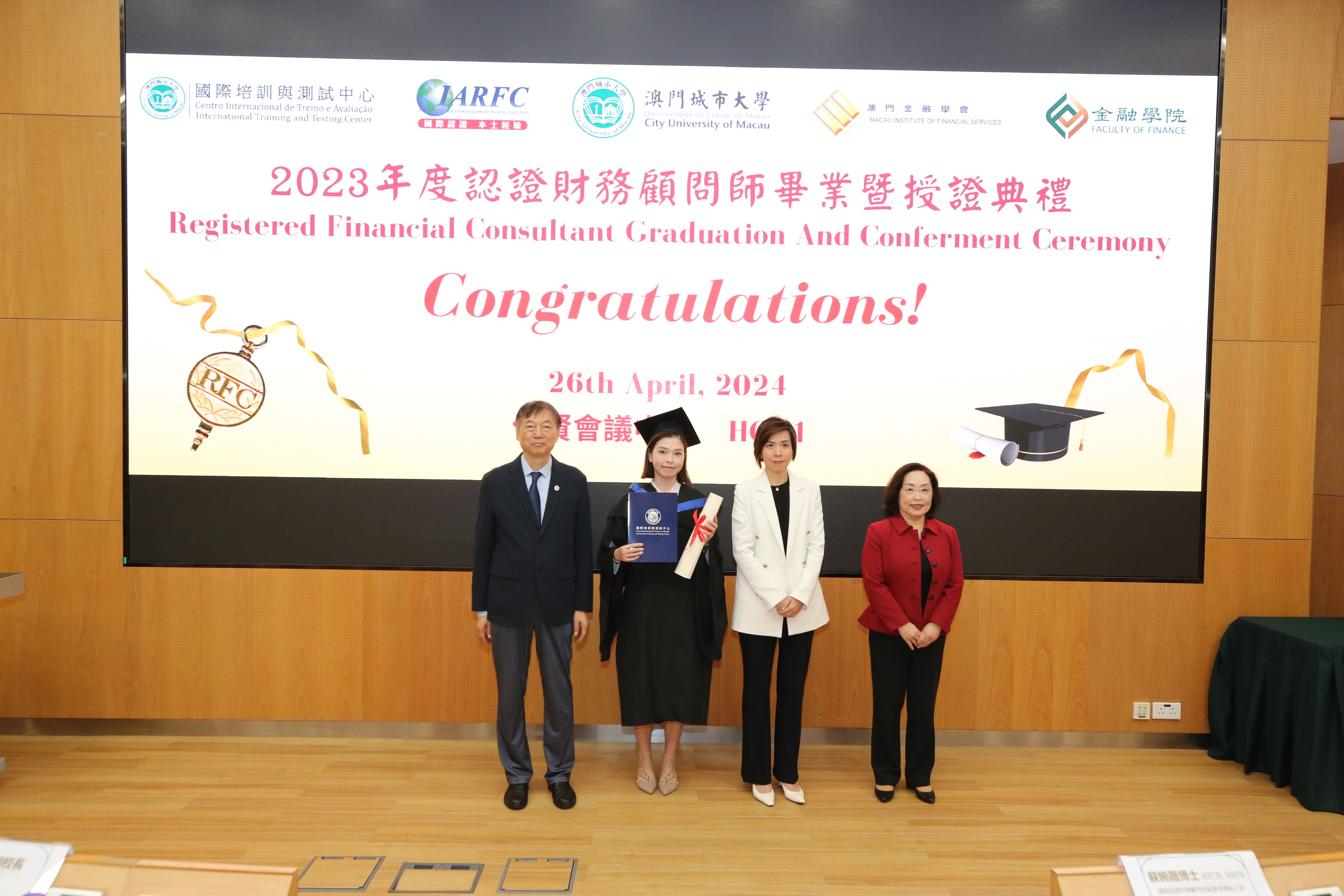 認證財務顧問師畢業暨授證典禮於二零二四年四月二十六日(星期五)假座澳門城市大學隆重舉行。典禮榮獲國際認證財務顧問師協會港澳區主席蘇婉薇博士RFC®, MRFS、澳門城市大學副校長周萬雷教授及澳門金融學會管理委員會主席李可欣女士擔任主禮嘉賓。蘇主席,周校長和李主席於典禮中分別致辭勉勵各獲授證學員。蘇主席熱烈歡迎應屆獲頒授RFC專業認證者加入IARFC的大家庭,並鼓勵他們與時並進,不斷提升競爭力。